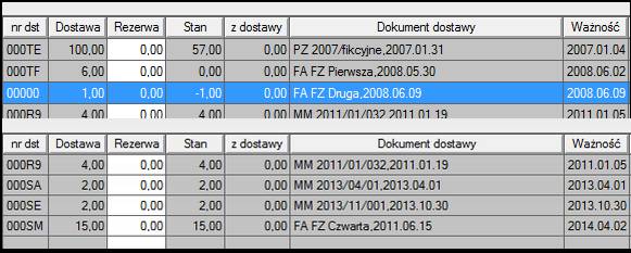 3) Okienko ze zrzutem dostaw widocznych w PZ 2007/fikcyjne - na spisie dostaw brakuje PZ 2007/A/001 i FZ Druga, FZ Trzecia. FZ Piąta ma nr dostawy 0000.