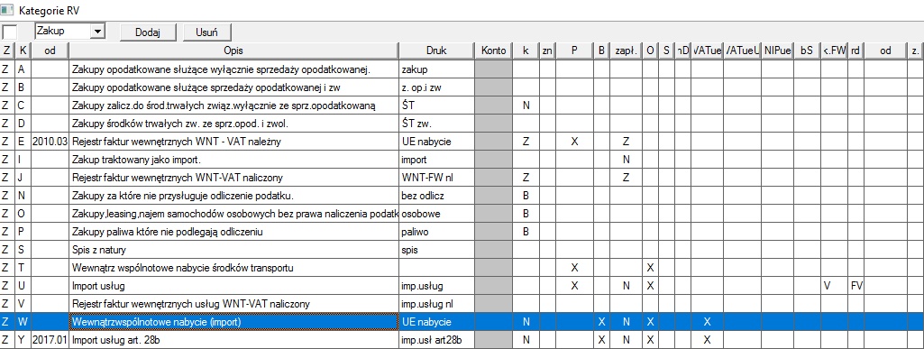 W kategoriach RV mam jak poniżej (patrz kategorie: W dla WNT i Y dla importu usług art. 28b ustawy )