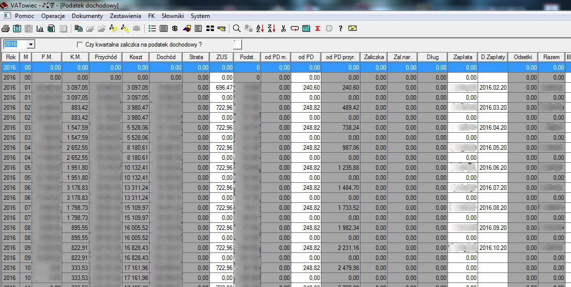 Ponieważ Vatowiec "dziwnie" policzył mi podatek dochodowy (znacznie więcej niż wychodziło z obliczenia dochód * stawka podatku), przeniosłam całość na pendriva, żeby pogrzebać i sprawdzić, co się dzieje. Odtwarzałam dane z archiwum, zrobiłam dogrywkę, reindeksację i dostałam ciekawe zestawienie do pdof: każdy miesiąc jest podwojony, niby wszystko liczy sie dobrze, prócz tego ostatniego, który ma dziwnie zawyżoną wielkość. W zestawieniu nie ma uwzględnionej zaliczki na ub. zdrowotne, ale nie w tym problem, więc na razie nie uzupełniałam.