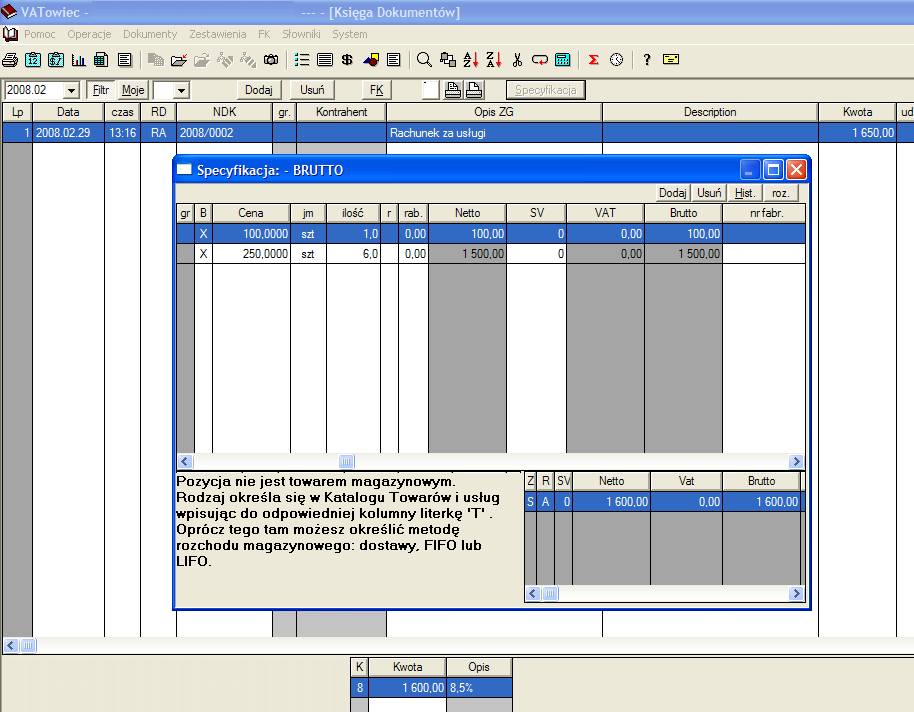 ma wartości 1x100 + 6x250 zl brutto, co powinno razem dać 1600 zł. Tak jest, tyle, że w podsumowaniu faktury wyświetla się 1650 zł.