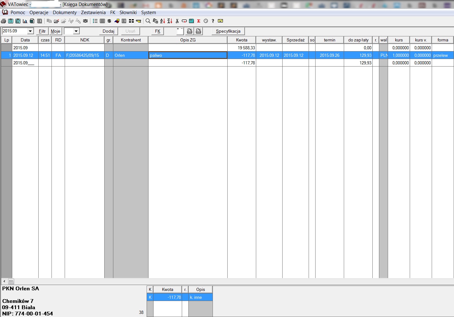 Poniżej poprawne księgowanie w KPiR faktury za paliwo z 50% odliczeniem VAT.