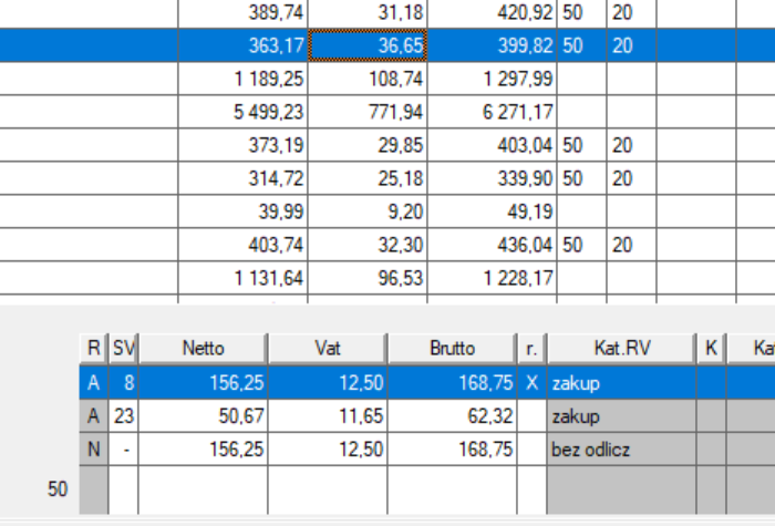 Spróbowałem też innej metody. Wprowadziłem pozycję ze stawką 8%, odblokowałem "ręcznie", wprowadziłem 50% do %VAT i system poprawnie wyliczył pozycję N. Teraz dodaje pozycję 23%, ponownie wprowadzam 50% do %VAT... niestety tym razem nic się nie zmienia. Pozycja 8% ma uwzględnione 50% VAT, a pozycja 23% nie zmieniła się i ignoruje wprowadzony procent podziału.