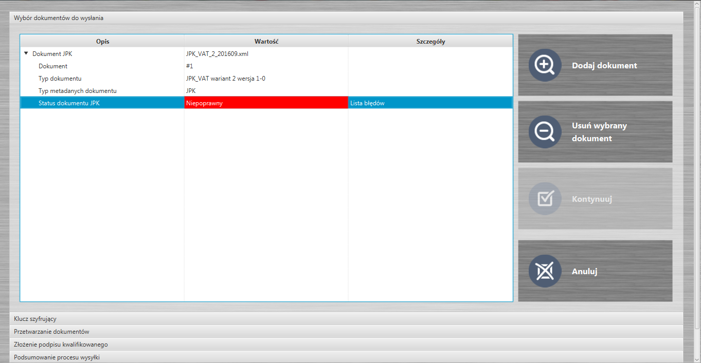tzn. po wyborze dokumentu do wysyłki "staus dokumentu JPK" : "Niepoprawny"