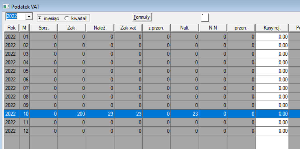 Niby wszystko dobrze. Sumuje, przechodzę do Podatek VAT. Tutaj z grubsza też niby wygląda dobrze, chociaż nie wiem dlaczego wszsytkie kwoty netto wpadają do zakupów: