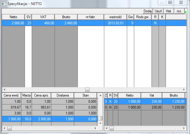 Towar zakupiony po 10zł (widać w lewym dolnym oknie pierwsza kolumna), wprowadzony w kat. N ze stawką zw, przy sprzedaży w specyfikacji nagle pojawia się koszt 12,30zł (prawe dolne okno, czwarta kolumna drugi wiersz), oczywiście nie można edytować ani nic zrobić.
