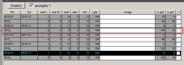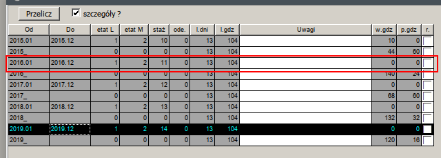 Jeśli nie, to moja propozycja jest taka, by Kadrowiec podczas przeliczania tabeli URLOP, wstawiał w wierszu [B] w kolumnach etatL i etatM, zamiast zer, informację o bieżącym etacie.