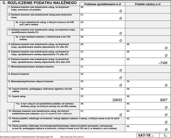 Przy próbie wydruku deklaracji VAT7k za pierwszy kwartał 2011 nie wypełnia mi się tabela C (rozliczenie podatku należnego). No może z małym wyjątkiem, którym jest Import usług.
