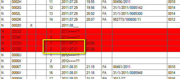W System->Tabele->"KD"->guzik [Dane] znalazłem pozycje nr 1 i 2, są one zaznaczone na czerwono jako skasowane.