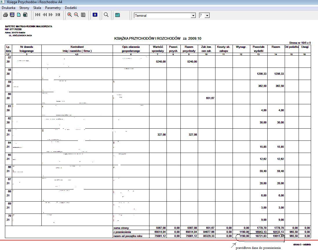 Wygląda to tak, że w wierszu z przeniesienia - gdzie mają być przeniesione dane z poprzedniego miesiąca (X-09)wszystko ładnie mi przenosi oprócz sumy kolumny 13-pozostałe wydatki. Kwota która mi sie zaciąga nie mam pojęcia skąd się wzięła. Dokładanie to samo dzieje sie z wydrukiem za mc XII.