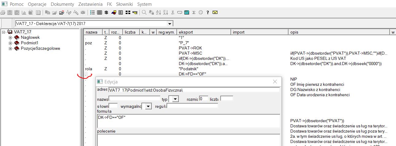 Witam, jestem nowym użytkownikiem programu. Mam problem z e-deklaracją VAT-7(17), tworzę ją tak jak opisują przy KPiR, pobierając druk ze strony ministerstwa finansów. Przy wpisaniu danych firmy zaznaczam formę prowadzonej działalności RE, i tu się zaczynają schodki - ryczałt prowadzi osoba fizyczna, a deklaracja tworzy się dla podatnika będącego osoba prawną, czyli zaznacza pierwszy kwadrat w poz.8 (VAT- 7), co powoduję, że poz. 9 pozostaje pusta. Nie wiem co mam zmienić w Definicja XML, żeby mi zaznaczał osobę fizyczną i przepisywał Imie, Nazwisko i Date urodzenia.