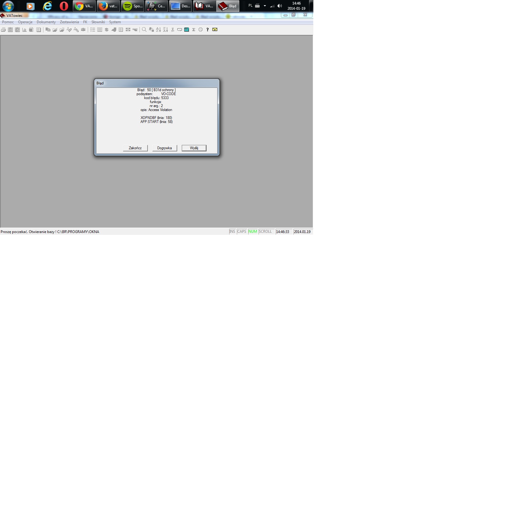 Przydarzył mi się pewien przykry incydent. W trakcie pracy z Vatowcem nastąpiła awaria zasilania. Po włączeniu komputera Vatowiec wprawdzie się uruchamia ale wybranie jakiejkolwiek bazy (korzystam z programu dla dwóch różnych firm) skutkuje pojawieniem się informacji o błędzie zawieszeniu się programu niezależnie od opcji, która się wybierze.