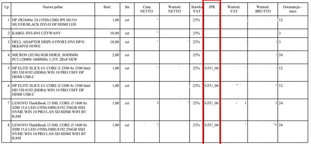 2. - dodatkowa kolumna w specyfikacji faktury, która zawierała by numer GTU danej pozycji, np: