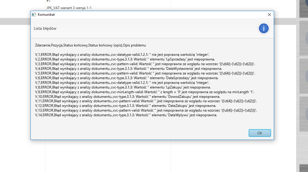 V,2,ERROR,Błąd wynikający z analizy dokumentu.,cvc-type.3.1.3: Wartość '' elementu 'NIP' jest niepoprawna.