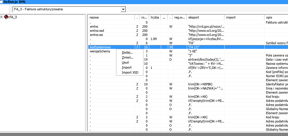 Po wciśnięciu lewego klawisza pokazuje się tabelka Definicje XML z oknem wyboru gdzie są pozycje