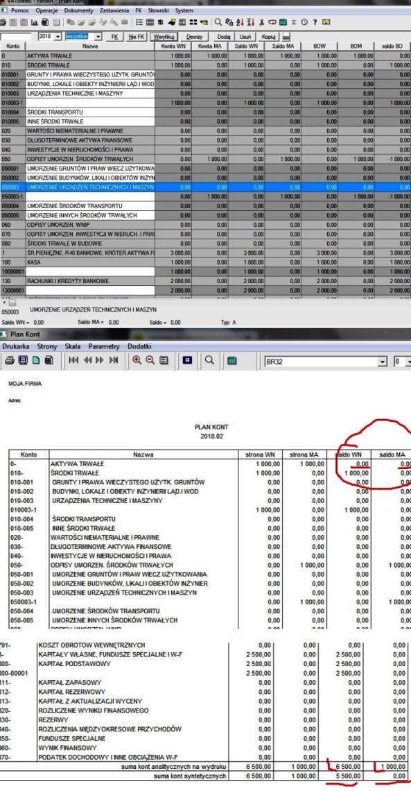na wydrukach plan kont , obrotówka bark prawidłowego sumowania w kolumnach saldoWN i saldoMa