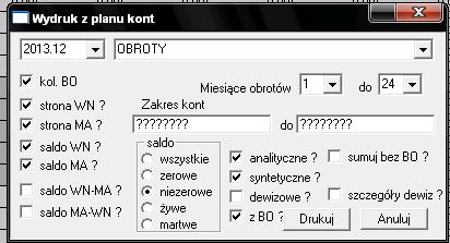 Więc wybieramy 2013.12 powiedzmy Plan Kont kolumny miesiące obrotów zgodnie z sugestią programu, zakres kont zgodnie z sugestią programu i klikamy wydrukuj.