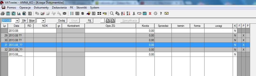 U mnie też takowe pozycje pojawiają się znikąd, wygląda to zupełnie tak samo jak na zrzucie kolegi, przechodzę na nowy miesiąc a te pozycje ze znakami "?" już tam są w Księdze Dokumentów. Czy ktoś potrafi dać odpowiedź dlaczego one się pojawiają i jak ustawić, aby się nie pojawiały?