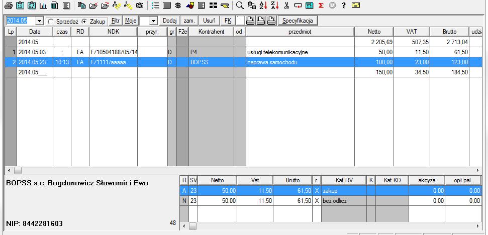 W maju dodałem faktury zakupowe, które w sumie dały 157,87 podatku VAT w kategorii A i 98,09 w kategorii N